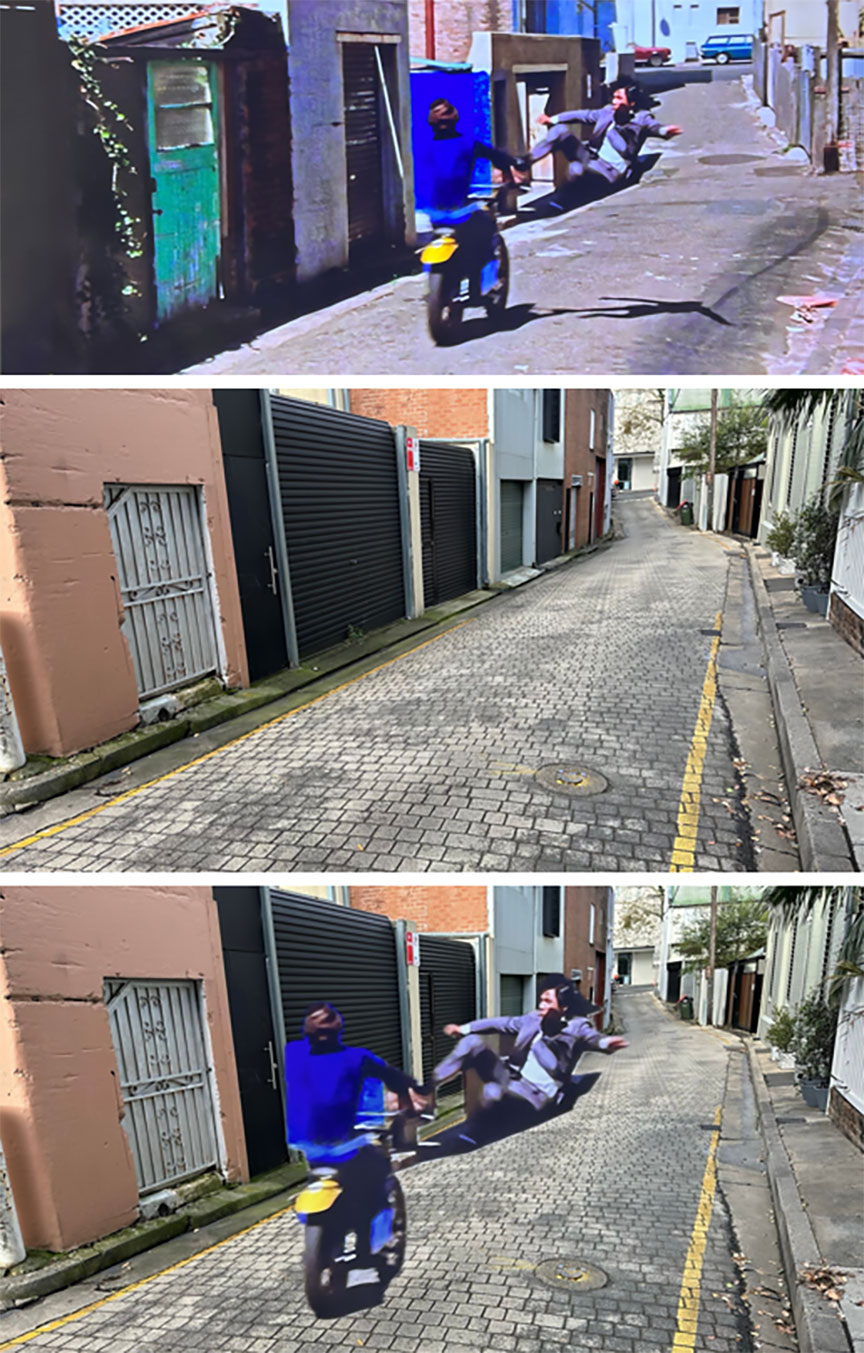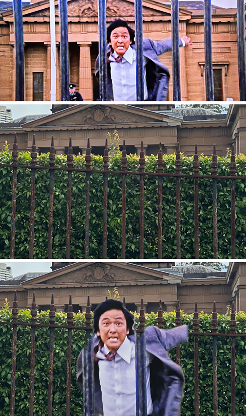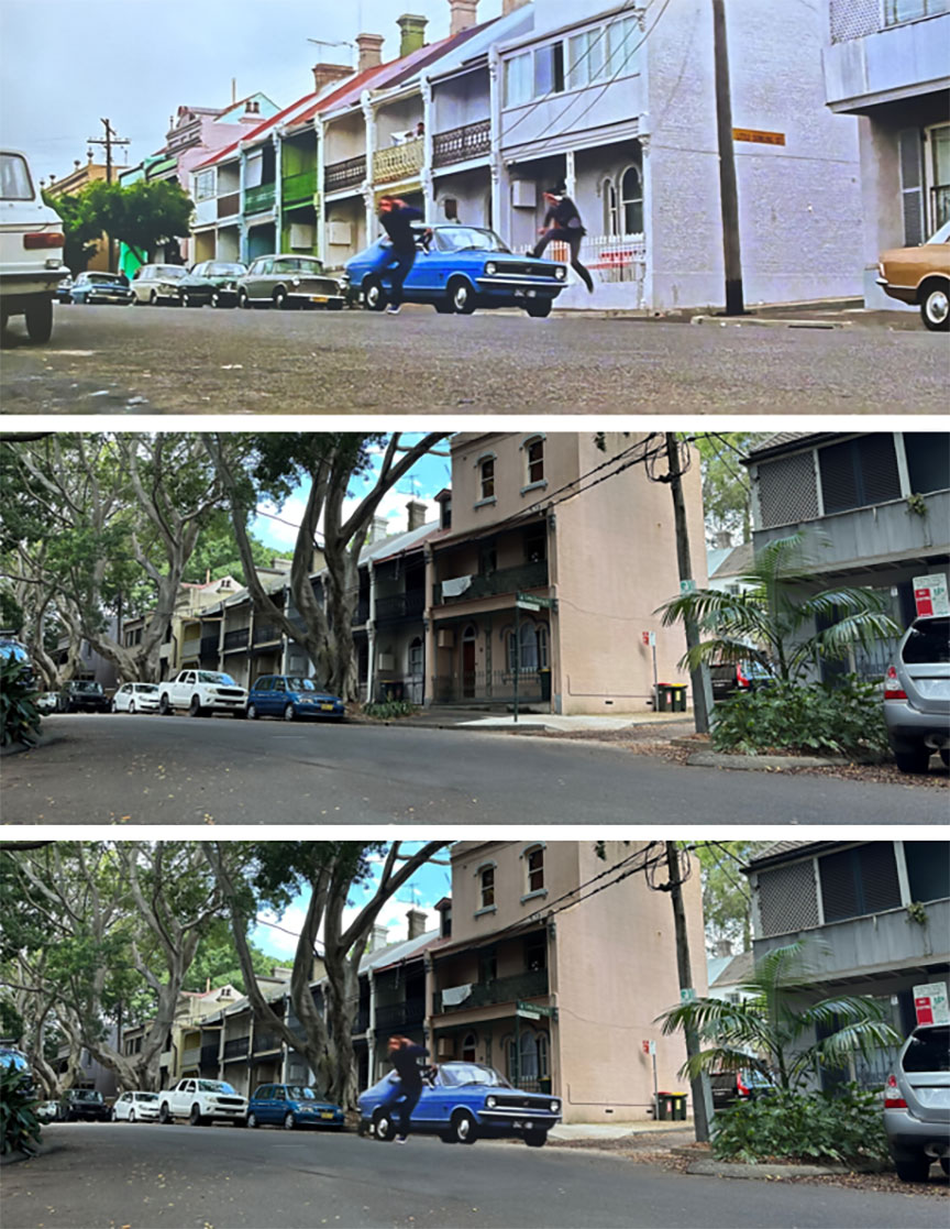 I have to say I didn’t do too badly, although the location I most wanted to find proved to be surprisingly elusive. The highlight of the entire chase takes part in a small lane, where Grant Page mounts a motorbike in an attempt to getaway, and then in the same shot Wang Yu launches into a flying kick that knocks him off the moving bike, sending them both sprawling across the concrete (the kick is followed by Page ducking into the open door of a restaurant kitchen where a fight breaks out, a part which was actually shot in Hong Kong!). Resorting to posting for some help in a Sydney Then and Now group on social media*, the prognosis originally looked grim, with locals from the era stating how many of those small lanes were sold off decades earlier and absorbed by extending existing properties. Thankfully this turned out to be a false alarm, and the lane was very much still alive and well, instantly recognizable once I knew where it was!