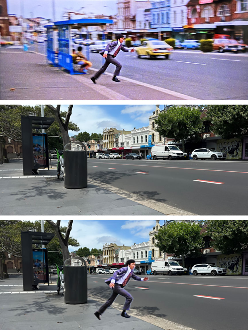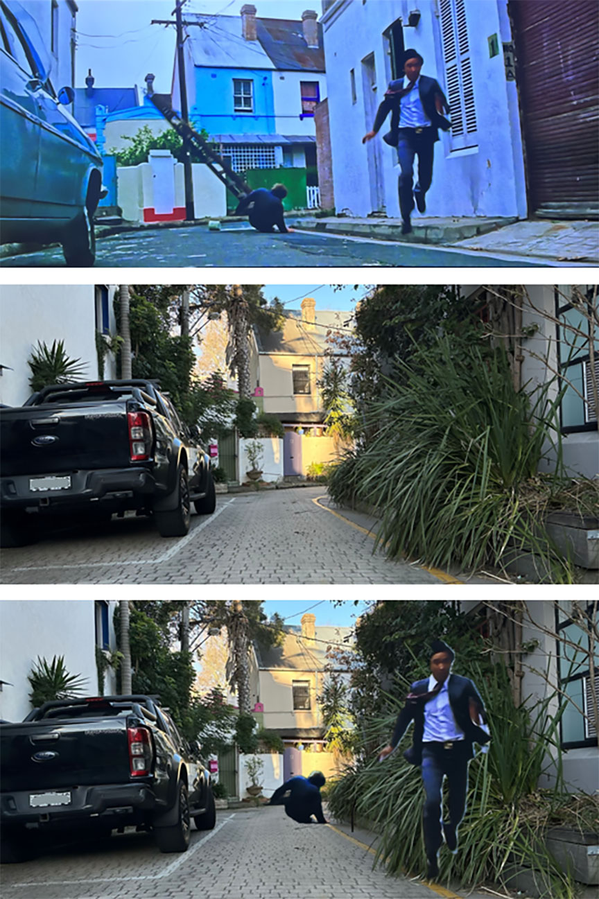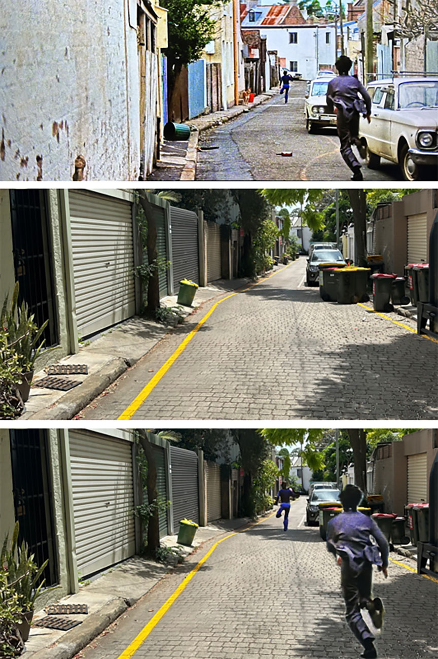 I have to say I didn’t do too badly, although the location I most wanted to find proved to be surprisingly elusive. The highlight of the entire chase takes part in a small lane, where Grant Page mounts a motorbike in an attempt to getaway, and then in the same shot Wang Yu launches into a flying kick that knocks him off the moving bike, sending them both sprawling across the concrete (the kick is followed by Page ducking into the open door of a restaurant kitchen where a fight breaks out, a part which was actually shot in Hong Kong!). Resorting to posting for some help in a Sydney Then and Now group on social media*, the prognosis originally looked grim, with locals from the era stating how many of those small lanes were sold off decades earlier and absorbed by extending existing properties. Thankfully this turned out to be a false alarm, and the lane was very much still alive and well, instantly recognizable once I knew where it was!