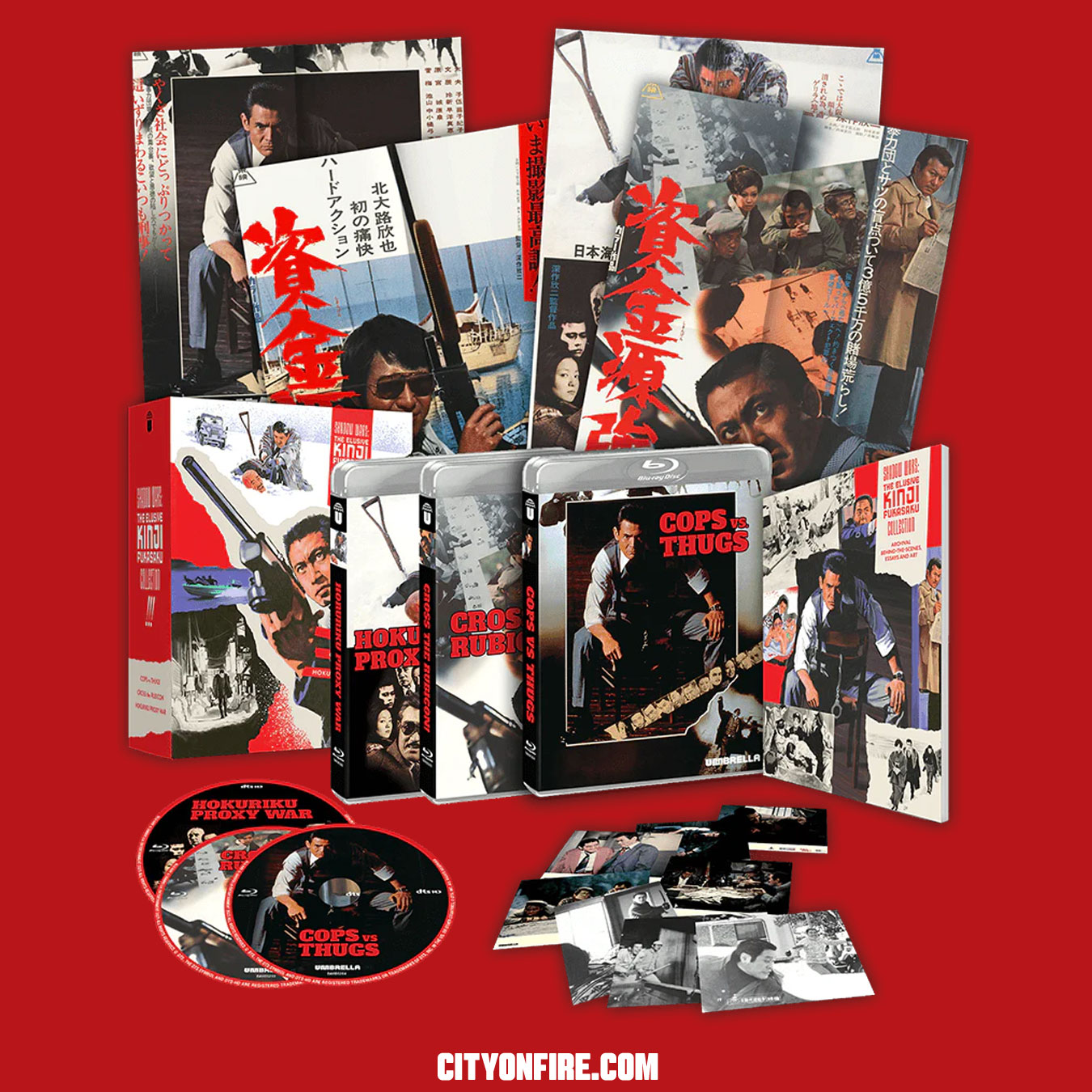On April 18, 2026, Umbrella (AU) is releasing the Blu-ray (Region B) for the Shadow Wars: The Elusive Kinji Fukasaku Collection, which includes 1975’s Cops vs. Thugs, 1975’s Cross the Rubicon! and 1977’s Hokuriku Proxy War.